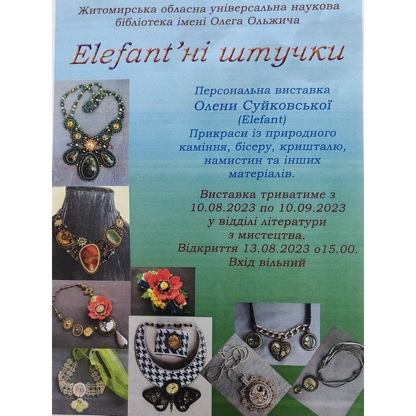 13 серпня 2023 року о 15:00 у відділі мистецтв бібліотеки відбудеться відкриття персональної виставки творчих робіт дизайнерки прикрас Олени Суйковської.