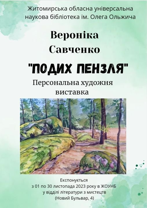 8 листопада 2023 року о 17:00 у відділі мистецтв ЖОУНБ ім. О. Ольжича відбудеться відкриття виставки художниці Вероніки Савченко.
