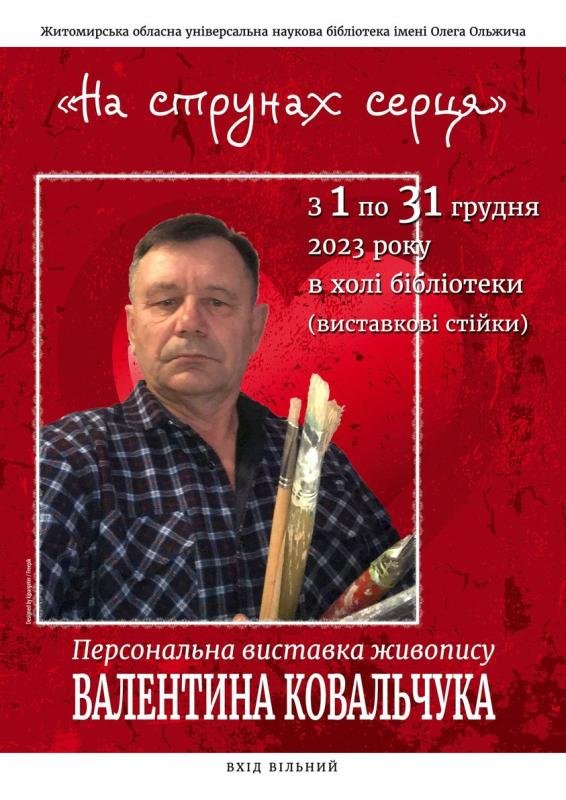 З 1 по 31 грудня 2023 року можна ознайомитись з живописом ВАЛЕНТИНА КОВАЛЬЧУКА на його персональній виставці в холі бібліотеки (на виставкових стійках).