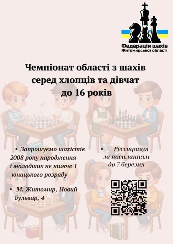 Запрошуємо на Чемпіонат Житомирської області з класичних шахів серед юнаків та дівчат до 16 років