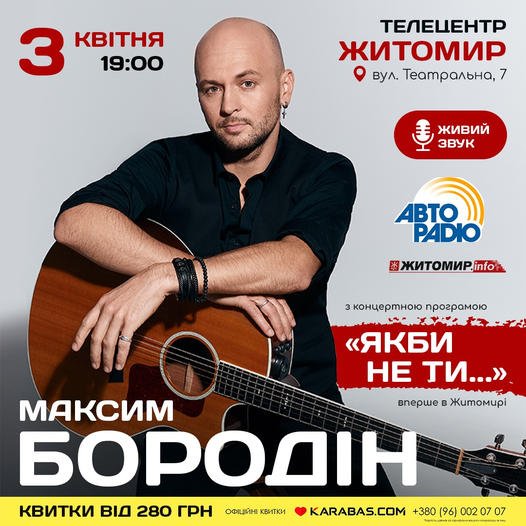 На широкий загал Максим став відомим завдяки участі у шоу «Голосу країни-12». Серед найвідоміших пісень артиста – романтичний хіт року «Якби не ти», який розкриває всю важливість та силу справжніх почуттів. У квітні Максим Бородін на прохання публіки відвідає вперше Житомир з сольним концертом.