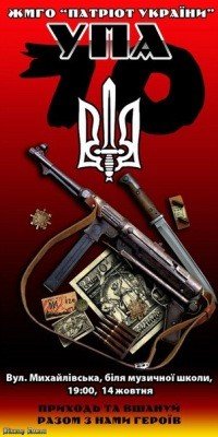 Житомирська Міська Громадська Організація "Патріот України" та Асоціація громадських обєднань "Нова Сила" запрошує житомирян на святкування 70 річниці створення Української Повстанської Армії. Армії, яка на власному прикладі показала, на що здатен людський дух, якщо він базується на ідеї власної незалежності.