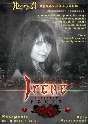 Группа Иерархия приглашает всех отпраздновать вместе с нами день рождения нашей очаровательной вокалистки Irene.