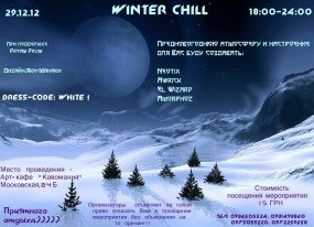 Здравствуй, Друг! Хочу пригласить Тебя 29-ого декабря в Кавоманию - ул. Московская 24, Б - посетить мероприятие, под кодовым названием "Winter Chill", что можна перевести, как "зимняя прохлада". Однако, тепло в наших серцах, а также соответствующая музыка, растопят льды и сосульки. Для этого будут стараться: