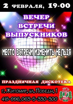Для Вас мы ежедневно собираем самые невероятные события города, которые могут вам подарить яркие эмоции и незабываемые впечатления. Афиша Житомира на 0412.ua — все то, что стоит увидеть, попробовать и почувствовать. Самая полная информация о культурной жизни города! Все события в ночных клубах, кинотеатрах, концертных залах, ресторанах и др. — все это и многое другое, вы найдете в Афише сайта города Житомира 0412.ua!