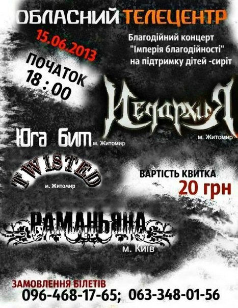 В концерті братимуть участь: гурти "Юга Біт", "Twisted", "Ієрархія"(Житомир) і "Раманьяна"(Київ).