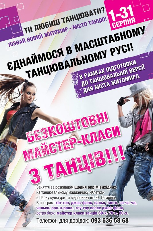 І етап: щотижневі майстер-класи від житомирських хореографів на танцювальному майданчику «Клетка» в Парку культури та відпочинку ім. Ю. Гагаріна ;
