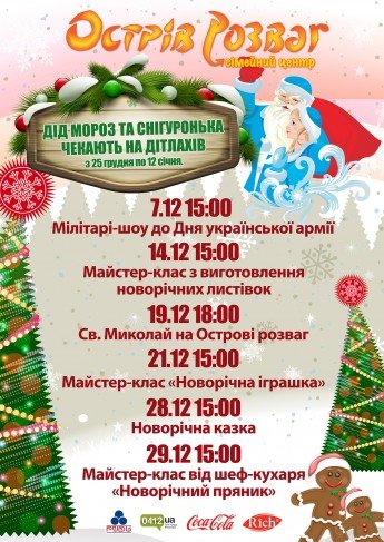 Дід Мороз та Снігуронька чекають на дітлахів на Острові розваг щодня з 25 грудня по 12 січня.