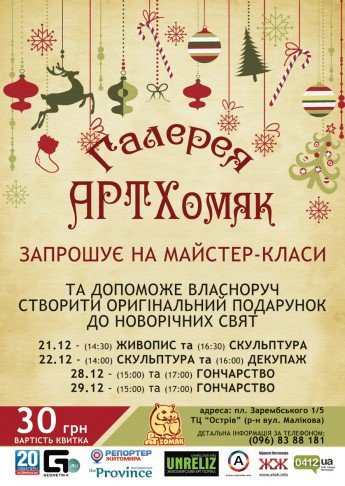 Обмежень у віці для учасників майстер-класів нема, тож можна приходити усією родиною і з користю й весело проводити декілька годин на вихідних зі своїм творінням, майстрами та хорошою компанією під супровід різдвяних мелодій.