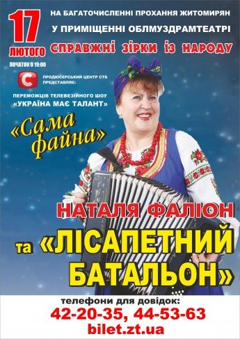 Поспішайте придбати свій квиток у концертній касі Житомирського театру та за телефонами (0412) 44-53-63; (063) 059-44-49; (098) 190-35-32.