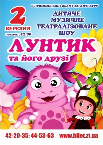Лунтік - це маленький інопланетянин, який народився на Місяці, але дивним чином опинився на Землі, на Сонячної Поляні. Разом з новими друзями, яких він знайшов на Поляні, Лунтік пізнає наш світ. Це миле, наївне і пухнаста істота, яке завойовує любов і повагу всіх дітей з першого погляду. Спектакль грунтується на популярному мультсеріалі Лунтік і його друзі, знятому кіностудією Млин. Кожна серія Лунтіка - це окрема повчальна історія, яка допомагає діткам дізнаватися багато нового.