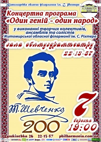 Житомирська обласна філармонія ім. Святослава Ріхтера запрошує житомирян та гостей міста, на гала-концерт з нагоди 200-річчя від дня народження Тараса Шевченка.