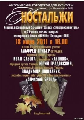 Мы хотим провести этот концерт, как неофициальную встречу бывших работников завода, в том числе, его ветеранов, с детьми и внуками работников завода в непринуждённой обстановке, сопровождаемой выступлениями бывшего инженера-конструктора и музыканта, приехавшего к нам из Израиля Альфреда Михайловича Грибера. Поддержку ему окажут знаменитые артисты города Житомира, предположительно народный артист Украины И.М. Сльота со своим ансамблем «Льонок», заслуженный деятель искусств Украины, профессор В.Ф. Шинкарук, народный артист Украины Ю.Г. Градовский.