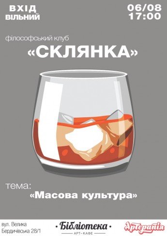 Вже сьогодні будемо говорити про масову культуру, її відмінність від мистецтва і чи є взагалі така межа, про культуру споживання та інше. Приходьте на розмови за склянкою