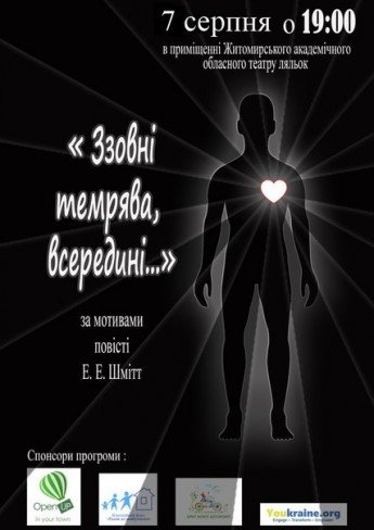 Сьогодні житомиряни матимуть можливість подивитись унікальний перфоманс "Ззовні темрява, всередині...", що піднімає проблеми соціалізації та комфортного життя людей з інклюзивністю (люди з інвалідністю, онкохворі...) у кожному куточку України.