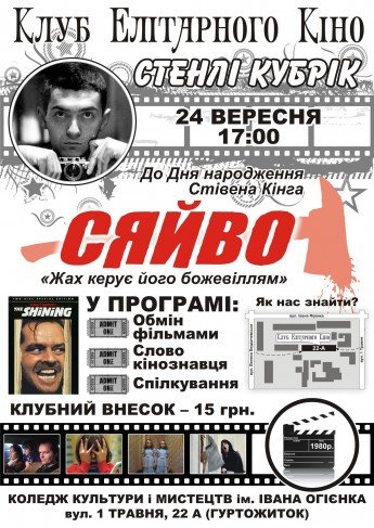 До дня народження Стівена Кінга Житомирський коледж культури і мистецтв імені Івана Огієнка організовує зустріч для тих любить твори Стівена Кінга, а також роботи Стенлі Кубрика. Неодмінно приходьте на зустріч, ми згадаємо фільм "Сяйво" знятий Стенлі Кубриком за однойменною книгою Стівена Кінга.
