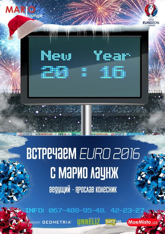 Мы решили посвятить Новогоднюю ночь выходу нашей сборной по футболу на Чемпионат Европы! Яркие украшения, девушки - группа поддержки, тематические конкурсы, сюрпризы и подарки и просто незабываемая ночь – все это ждет Вас в Марио Лаунж 31 декабря! Гостей которые захватят с собой футбольную атрибутику – будь то шарф или свисток – мы не оставим без подарка!