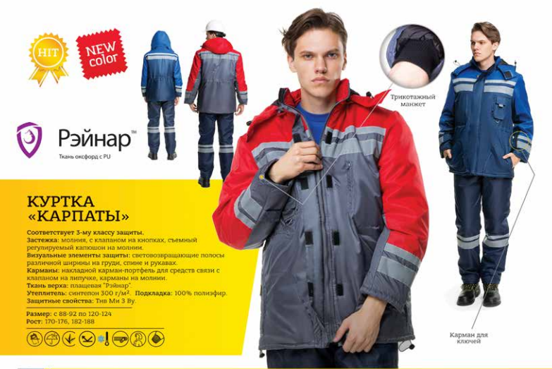 - Зимняя спецодежда, включая: костюмы, полукомбинезоны, зимние куртки, трикотаж, головные уборы.