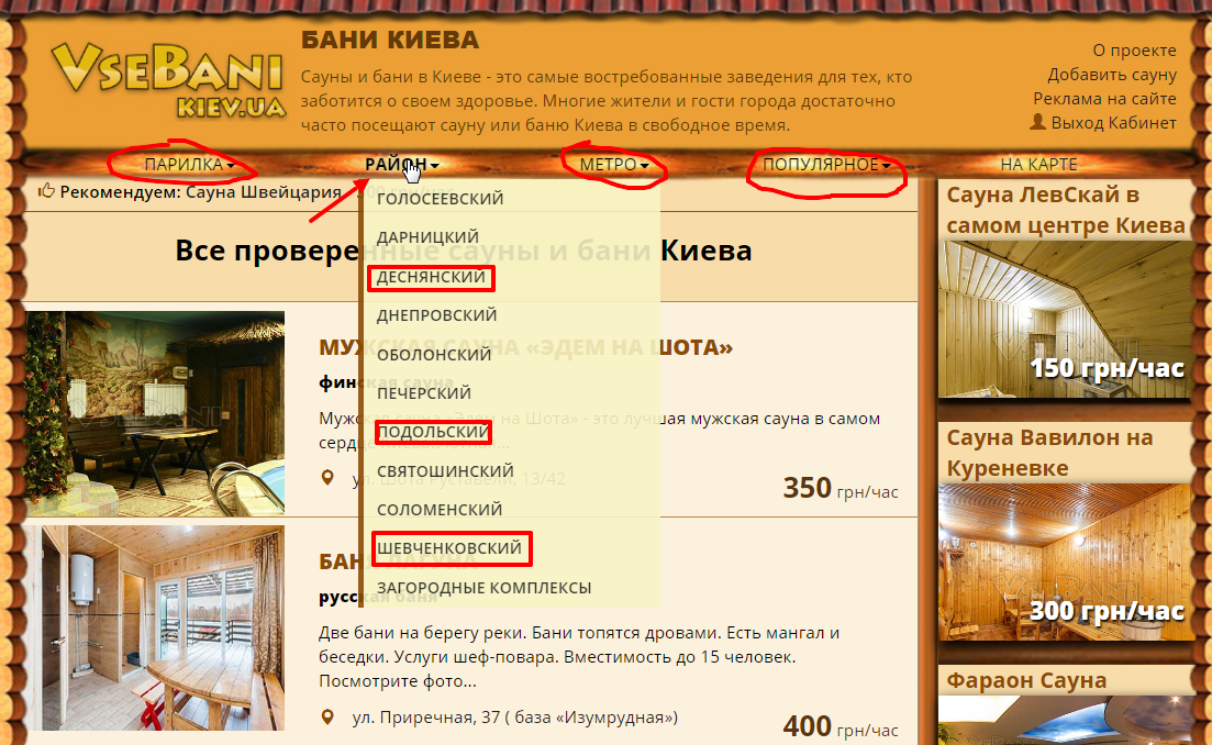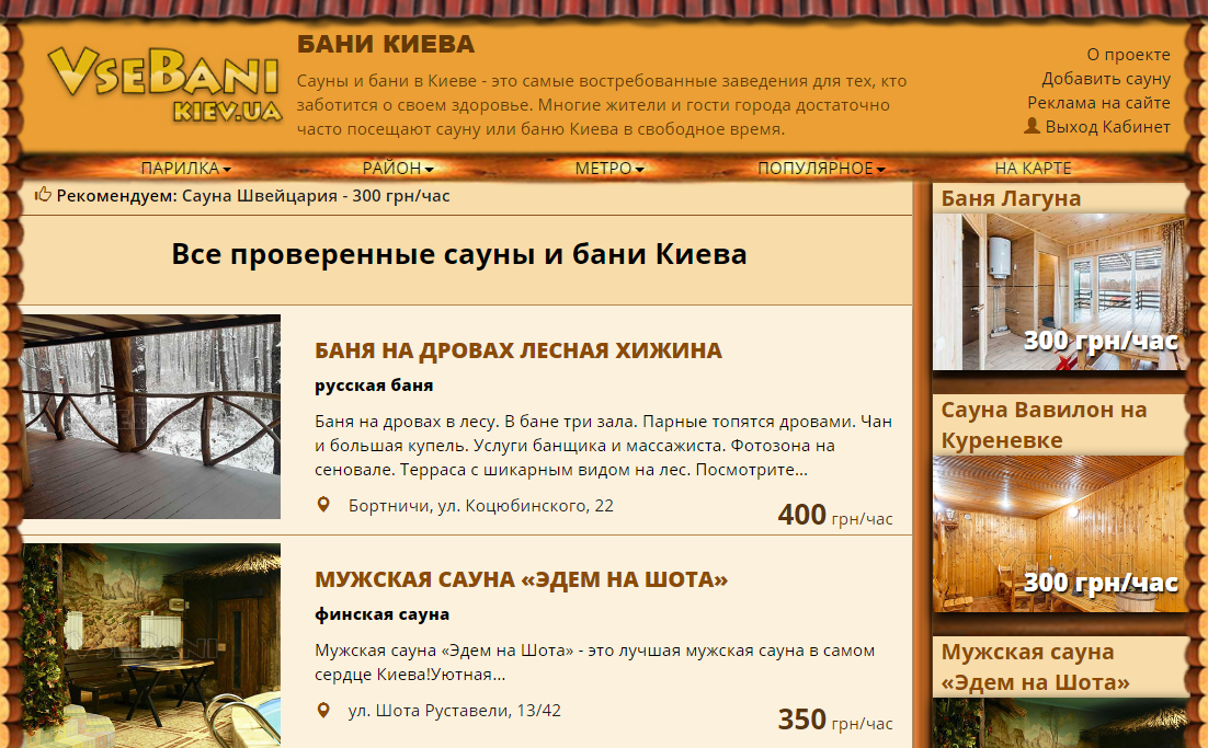 Для кожної бані та сауни на сайті є окрема сторінка з детальною інформацією, фотографіями, контактними даними, цінами та відгуками. Перед тим, як замовити баню чи сауну, уважно ознайомтеся з інформацією, подивіться фото, почитайте відгуки. До речі саме у відгуках можна знайти «ексклюзивну» інформацію, яка не прописана на сайті і про яку Вам не розповість жоден адміністратор бані.