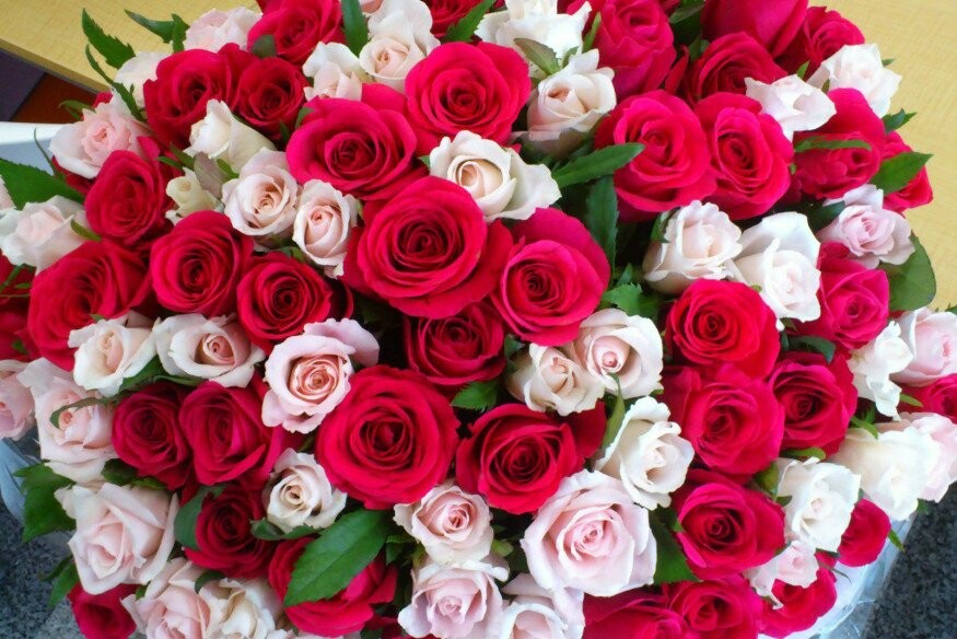 Уместны разноцветные букеты в розово-красно-белой палитры. Иногда ее разбавляют нежными бежевыми цветами.