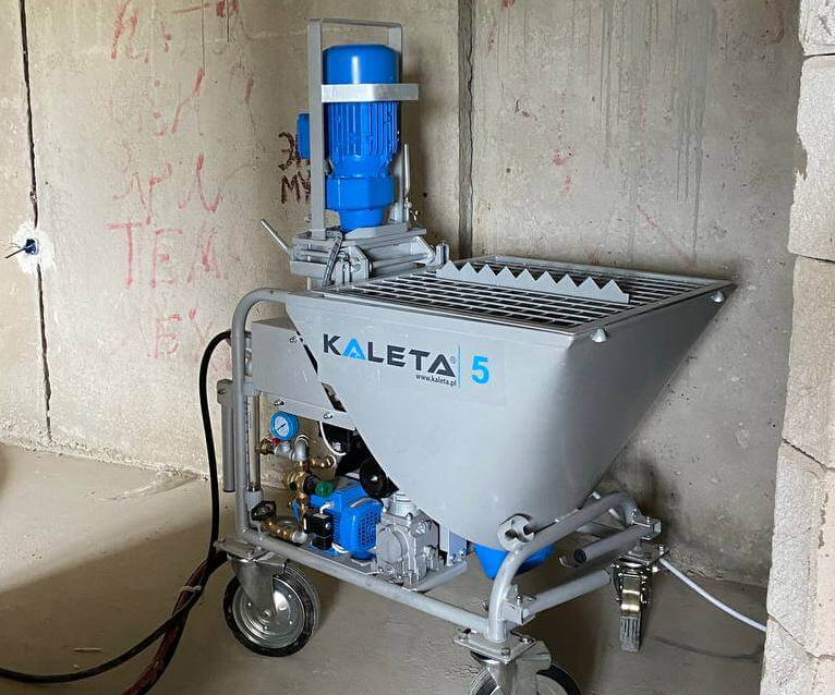 Машинная штукатурка выполняется профессиональной и компактной установкой Kaleta 5. Данная модель позволяет подавать смесь на высоту до 10 м по вертикали и 20 м по горизонтали, при этом оператор может регулировать толщину подаваемого раствора.