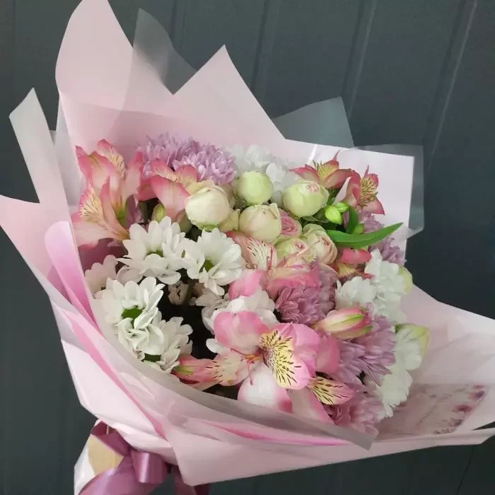 Если вы хотите пожелать хорошего дня, прекрасного настроения, крепкого здоровья и благополучия, можно выбрать букет из пионов, ромашек, гербер или альстромерий.