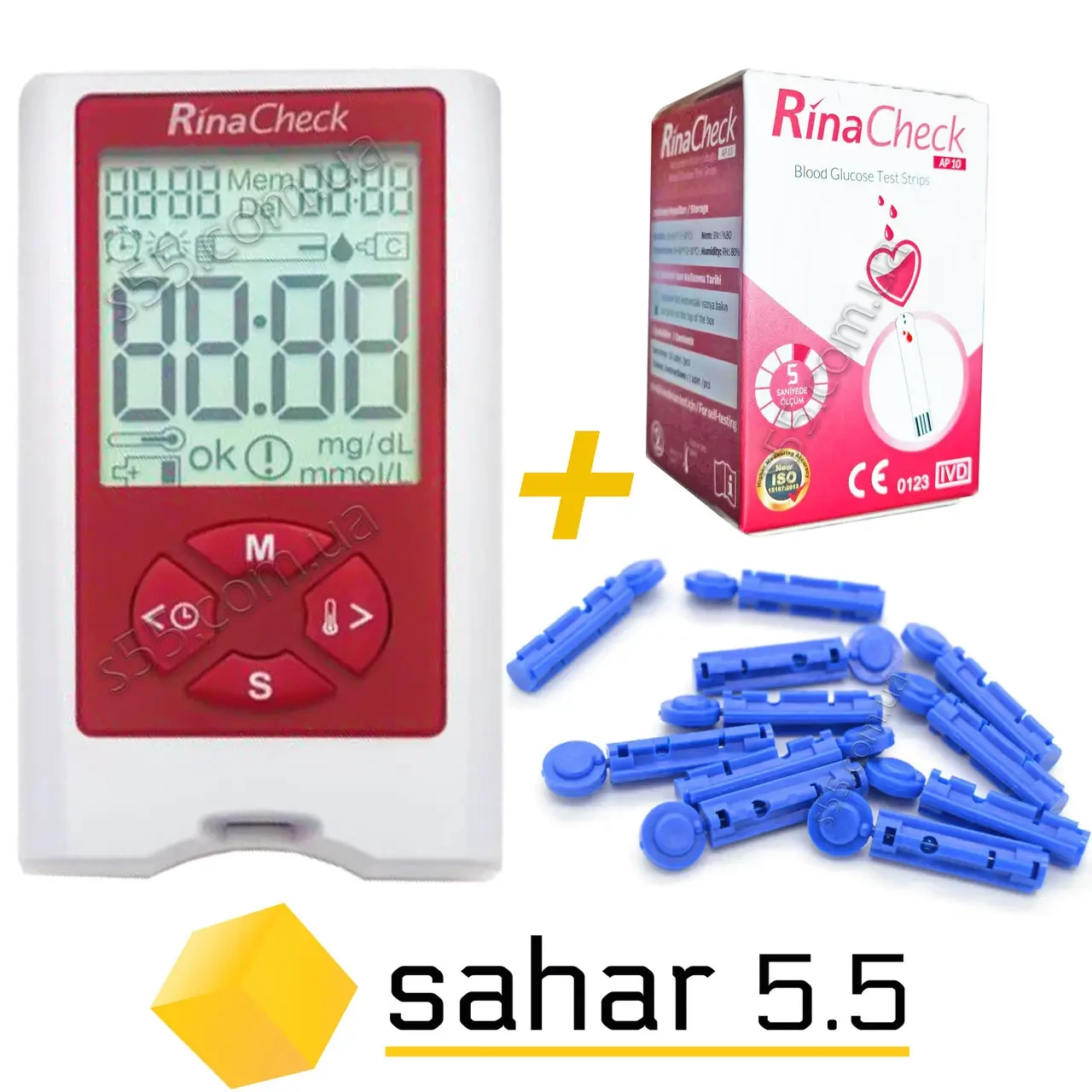 Інша поширена модель — Ріна Чек. Його обирають за доступну ціну, хорошу якість збірки та великий екран, що зручно для людей із порушенням зору. Пристрій запам’ятовує до 250 результатів і дозволяє відстежувати динаміку рівня цукру.