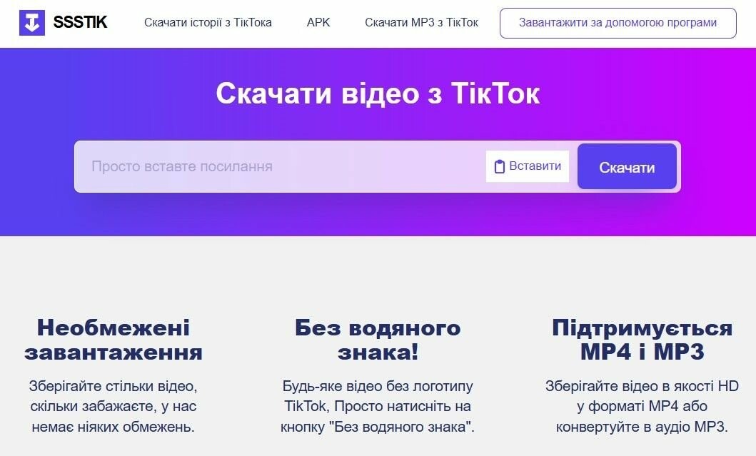 Сервіс sssTik.io пропонує зручний спосіб скачати відео з тік ток без встановлення додатків на ваш телефон чи комп'ютер. Інструмент працює безпосередньо через браузер і не потребує реєстрації.