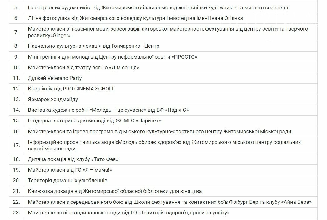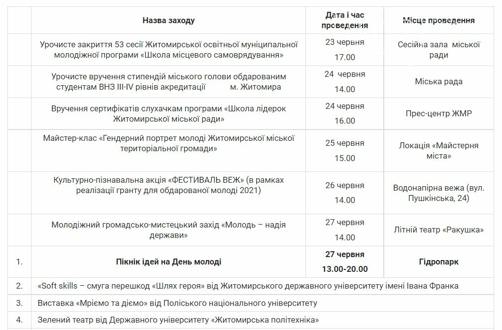 На сайті Житомирської міськради опублікували план заходів до Дня молоді.
